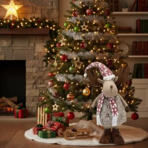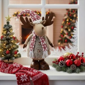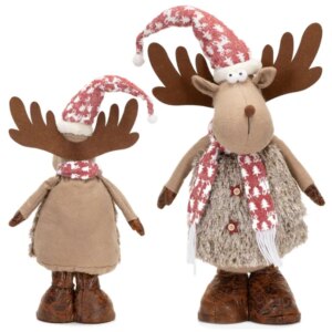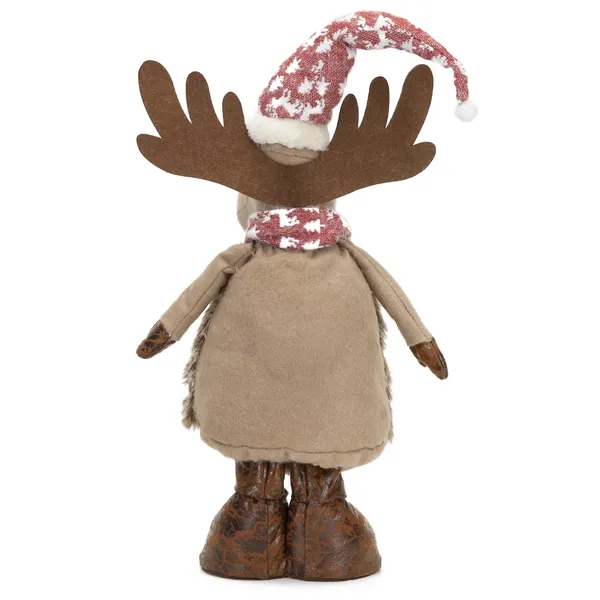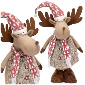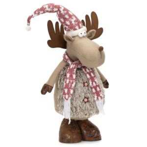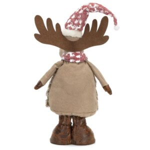 Hangulatos, 74 cm magas rénszarvas textilfigura, amely stabilan áll a bejáratnál, a fa mellett vagy az ablakban. A szabadon köthető sállal könnyen személyre szabhatod az ünnepi megjelenést, a puha anyag pedig barátságos, otthonos díszítést ad.