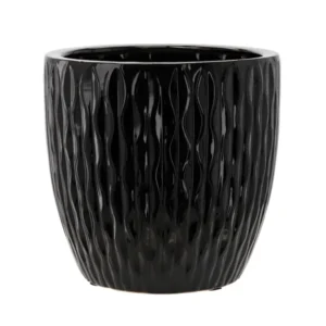 Stílusos, magasfényű fekete kerámia kaspó, amely stabil tartást és elegáns megjelenést biztosít nagyobb szobanövényeidnek is; időtálló megoldás modern és klasszikus terekbe egyaránt.