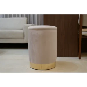 Kompakt puff, amely egyszerre szolgál kényelmes ülőhelyként, lábtartóként és dekoratív kiegészítőként; szürke plüss felülete és arany szegélye elegáns glamour hangulatot varázsol a nappaliba, hálóba vagy előszobába.