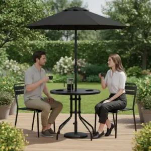 Edzett üveglapos kerti asztal 80 cm – praktikus választás erkélyre, teraszra vagy a kertbe. A kerek asztallap kényelmes felületet ad kávéhoz, snackekhez és kisebb kiegészítőkhöz, miközben a stabil váz biztonságos használatot nyújt a szabadban is.