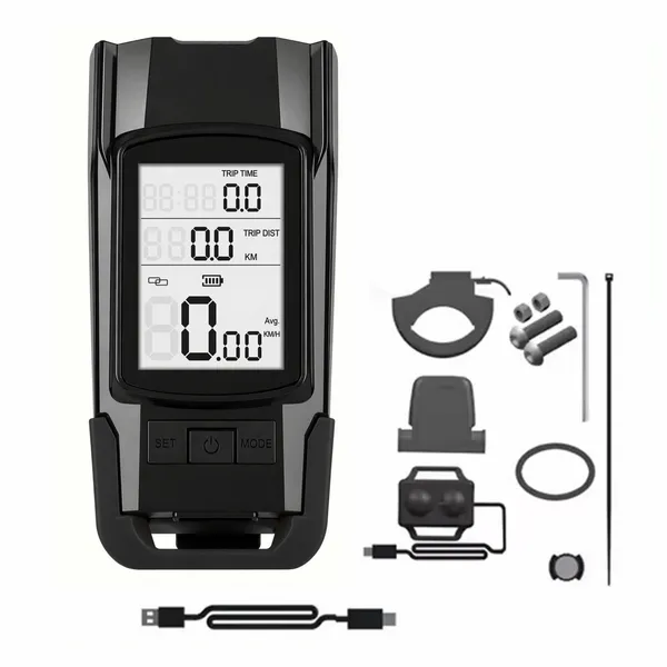 Komplett, 4 az 1-ben kerékpáros szett, amely egy első lámpát, hátsó lámpát, vezeték nélküli kilométerórát és csengőt egyesít egy praktikus csomagban. Ideális választás mindennapi közlekedéshez, városi tekeréshez és kirándulásokhoz, mert egyszerre javítja a láthatóságot és segíti a menetadatok követését.