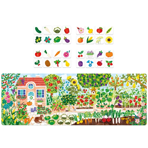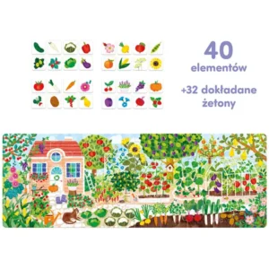 A kert témájú, 40 darabos puzzle és a nagy poszter egyszerre fejleszti a finommotorikát, a megfigyelőképességet és a növényismeretet, miközben vidám közös programot kínál az egész családnak.