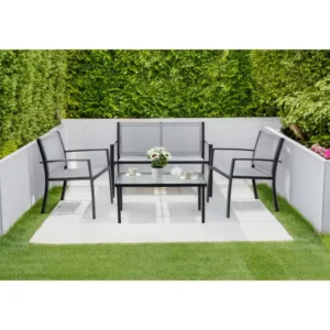 Dobja fel teraszát vagy kertjét ezzel a modern, 4 részes kerti bútorszettel, amely egy kényelmes kétszemélyes padot, két karfás széket és egy elegáns, edzett üveg asztalt tartalmaz. A porszórt acélváz korrózió- és karcálló, a textilén huzat pedig színtartó, légáteresztő és könnyen tisztítható, így hosszú távon is megőrzi újszerű megjelenését.