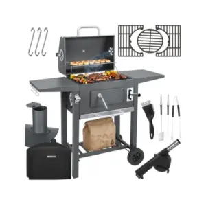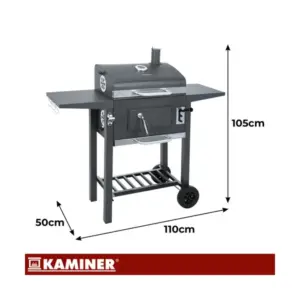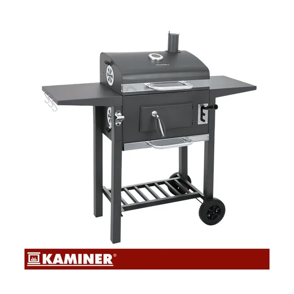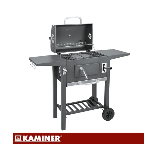 A masszív, fedeles faszenes grill öntöttvas ráccsal, beépített hőmérővel és állítható tűztérrel segít az egyenletes sütésben és a könnyebb hőszabályozásban. A védőhuzat, a hamutálca és a praktikus polcok kényelmesebbé teszik a használatot és a tárolást.