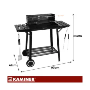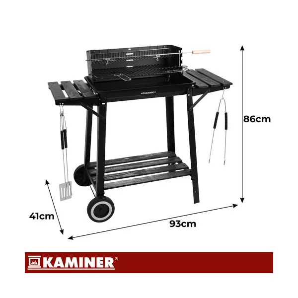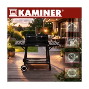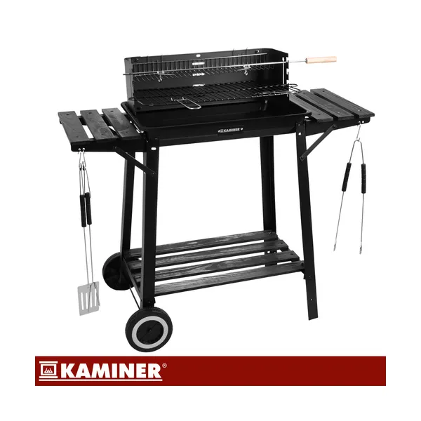Stabil, jól felszerelt faszenes grill forgónyárssal, felső melegítőrácsokkal és praktikus polcokkal, hogy egyszerre több ételt készíthessen kényelmesen. A krómozott sütőfelületek és a masszív kialakítás könnyebb tisztítást, egyenletes sütést és megbízható használatot biztosítanak.