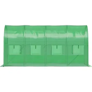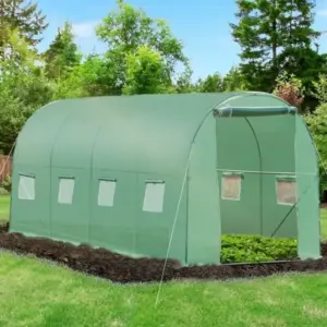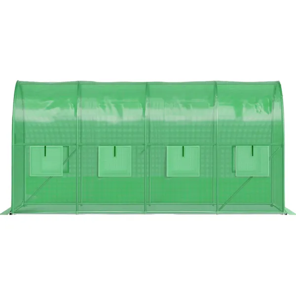 A stabil, horganyzott fémváz jó teherbírást és korrózióállóságot biztosít, míg a 140 g/m² vastag PE fólia UV- és nedvességálló kialakításának köszönhetően tartós használatot nyújt. A feltekerhető, cipzáras bejárat kényelmes hozzáférést ad a belső térhez, a szúnyoghálóval ellátott ablakok pedig segítik a szellőzést és a rovarok elleni védelmet.