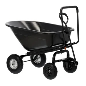 A 180°-ban elforduló első tengely kis fordulókört biztosít, a pneumatikus, mintázott gumikerekek pedig kímélik a gyepet és egyenetlen talajon is sima futást nyújtanak. A csúszásmentes, 82 cm-es húzókar kényelmes fogást ad, míg a billenthető, reteszes kád gyors ürítést tesz lehetővé.
