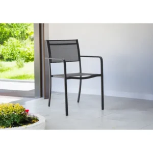 Kerti szék, fekete, acél váz, Textilene, 54×55×86 cm, rakásolható