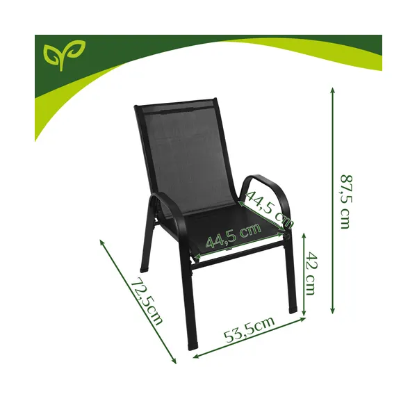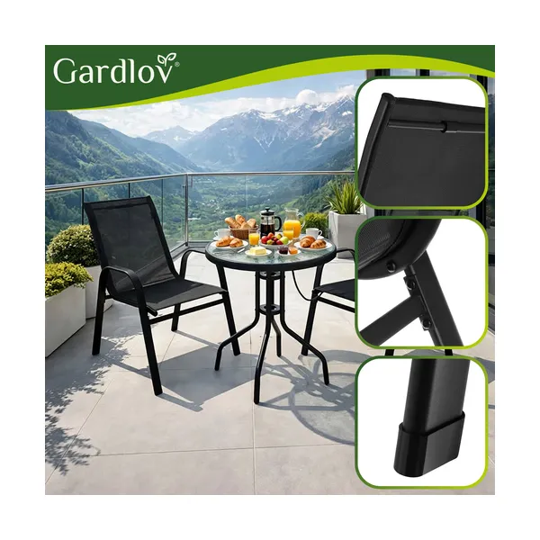 Tartós, kényelmes, két darabos kerti székszett erkélyre és teraszra: porfestett fém vázzal, szellős ülőfelülettel és UV‑, valamint vízálló kialakítással. Rakásolható, könnyen tisztítható, a talpvédők pedig segítenek megóvni a padlót a karcoktól.