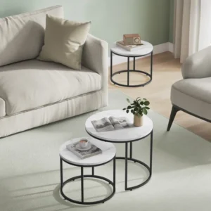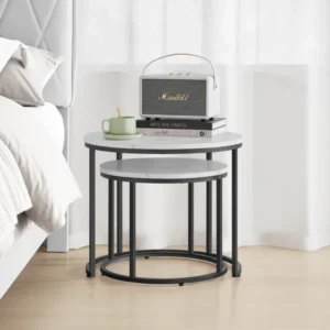 Modern loft stílusú, két darabból álló kerek dohányzóasztal szett, mely elegáns márványhatású asztallapjaival és fekete, porszórt fém vázaival bármely nappali, hálószoba vagy otthoni iroda központi eleme lehet.