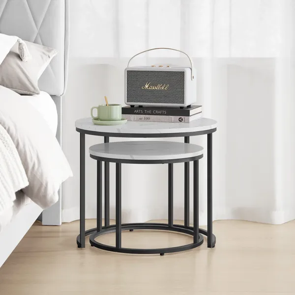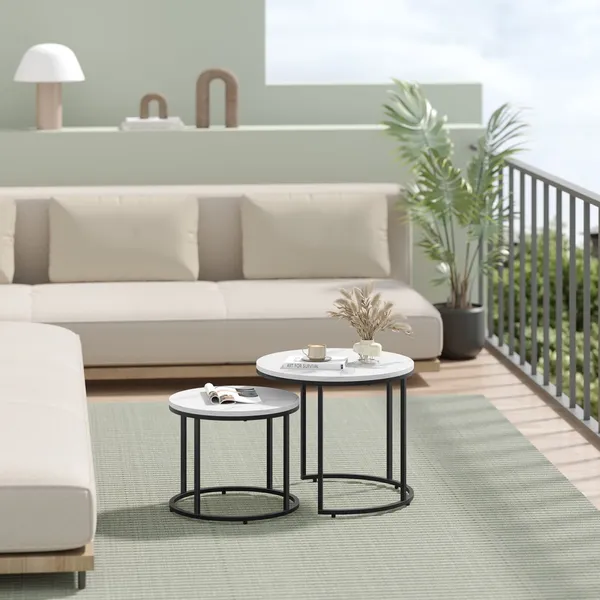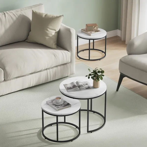 A két különböző méretű, márványhatású asztallal rugalmasan alakíthatod a nappalid, miközben a porszórt fekete fém váz hosszan tartó stabilitást biztosít. Kompakt, 10 perc alatt összeszerelhető dizájnelem, amely modern és klasszikus enteriőrben is stílusos.