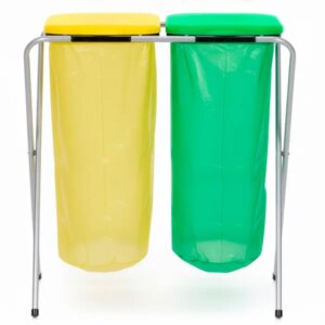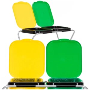 Praktikus, kétrekeszes hulladékszelektáló állvány, amely segít rendet tartani a konyhában, irodában vagy a háztartási helyiségben. A stabil, mégis könnyű fém vázhoz két PP fedél tartozik (zöld és sárga), így gyorsan elkülöníthetők a különböző típusú hulladékok.