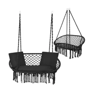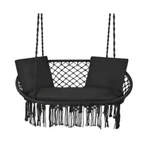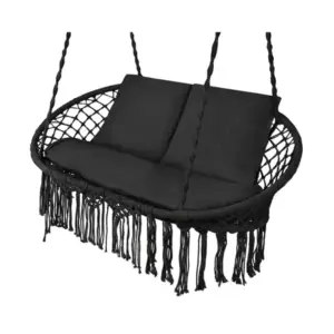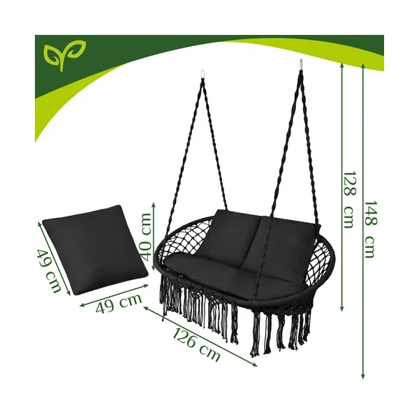Ez a függő hinta nemcsak kényelmes, hanem mutatós kiegészítő is. A fekete szín és a bohó stílusú megjelenés elegáns hangulatot teremt, miközben a masszív szerkezet biztonságos használatot biztosít a mindennapokban.
