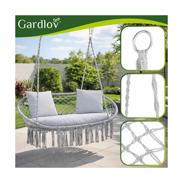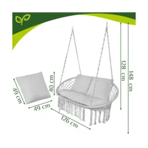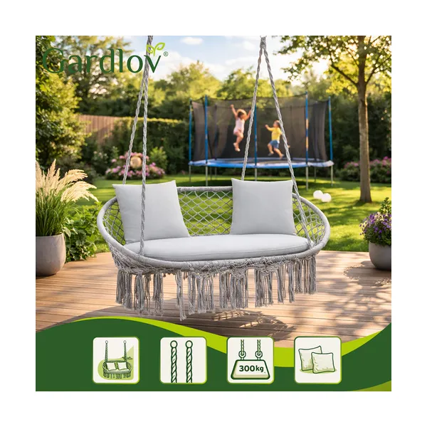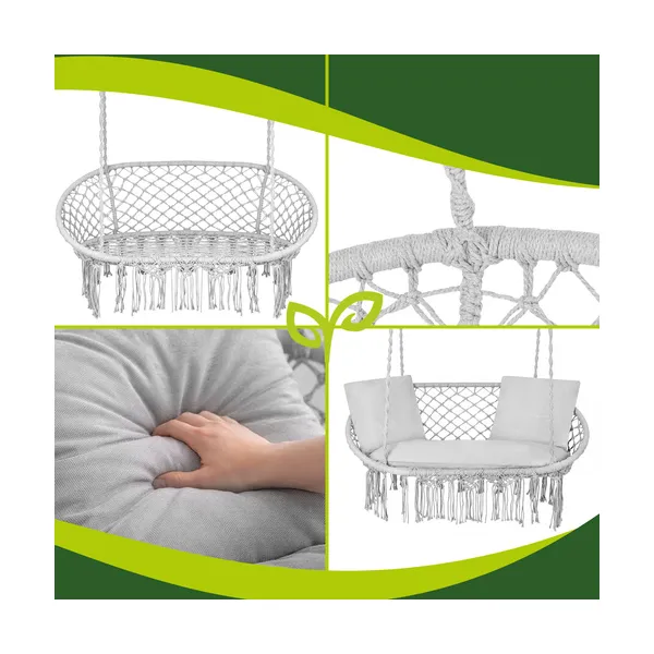 Kényelmes, kétszemélyes fészekhinta szürke színben, puha párnákkal a nyugodt pihenéshez a kertben, teraszon vagy akár a nappaliban. A stabil, 300 kg teherbírású kialakítás és a biztonságos felfüggesztés kellemes ringatózást ad, amit a család minden tagja élvezhet.