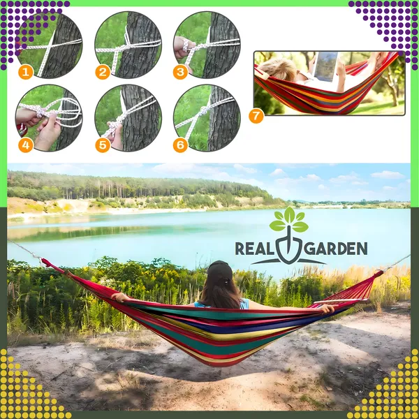 Élvezze a valódi pihenést ebben a kétszemélyes, XXL méretű függőágyban, amelyet sűrű szövésű, lélegző pamutból készítettek. A 40 cm-es, enyhén ívelt fa terpeszrúd stabilan tartja a fekvőfelületet, így a ringatózás még kényelmesebb. A függőágy kültéren és beltéren egyaránt használható, gyorsan felállítható, majd a mellékelt hordtáskában egyszerűen elpakolható.