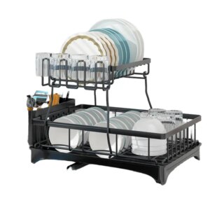 A kétszintes állvány akár 10 tányért, 14 tálat, bögréket és evőeszközöket szárít egyszerre, miközben helyet spórol. A döntött tálca a vizet közvetlenül a mosogatóba vezeti, így elfelejtheti a nedves pultot.