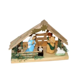 A figurák: Mária, József, a Kisjézus jászolban, pásztor, bárány, valamint a háromkirályok. A csomag a képen látható összes elemet tartalmazza; elemes világítással nem rendelkezik.