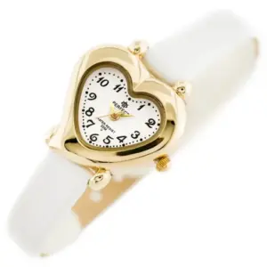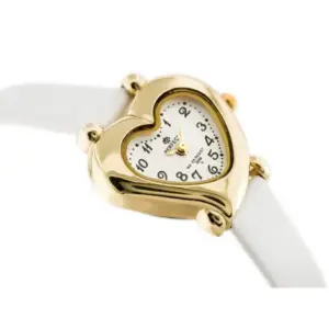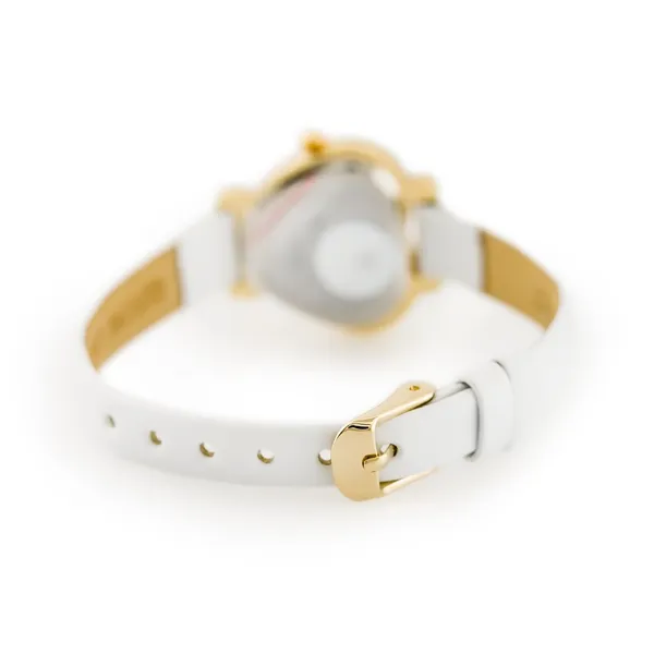 Az aranyszínű tok, valamint a fehér számlap és szíj harmonikus, ünnepélyes összhatást teremtenek. A visszafogott, kedves stílus miatt az óra nemcsak elsőáldozási ruhához, hanem iskolai és hétköznapi öltözékhez is jól passzol.