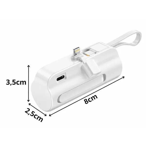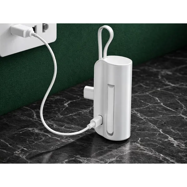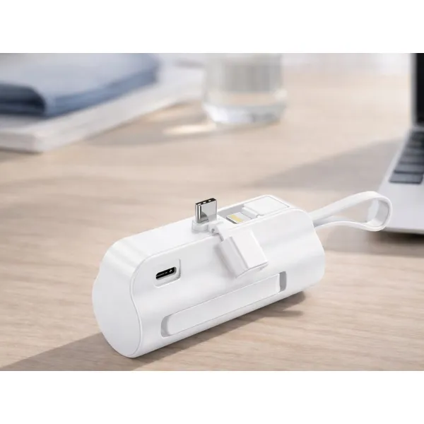 Kis méretű, 5000 mAh-s külső akkumulátor beépített Lightning és USB-C csatlakozóval, így útközben is tölthetsz külön kábelek nélkül. Zsebben is elfér, a strapabíró ház pedig segít megvédeni a powerbankot a mindennapi használat során.