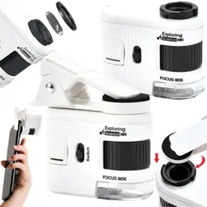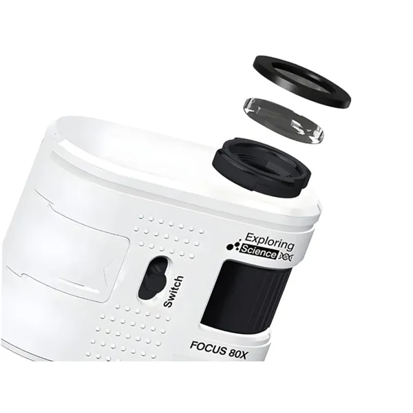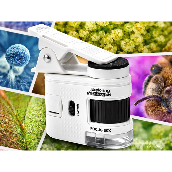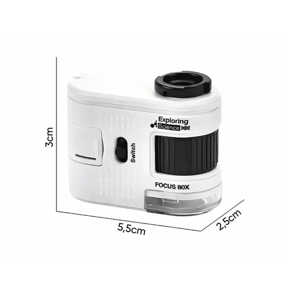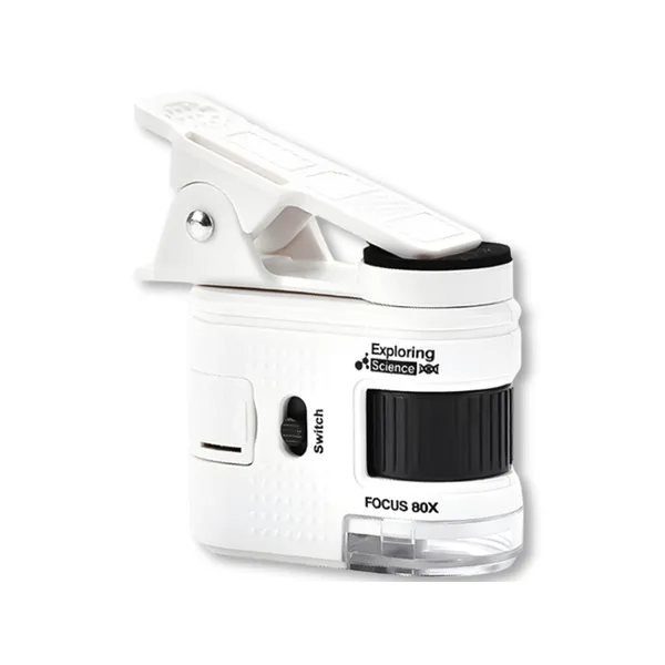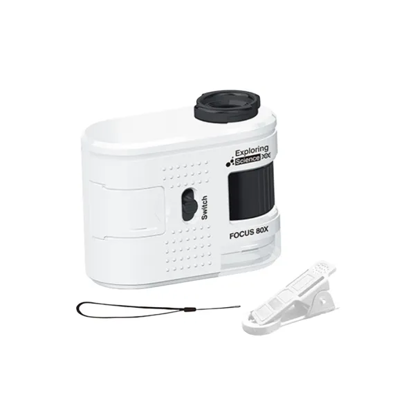 Kompakt zsebmikroszkóp, amelyet egyszerűen a telefonodra csíptethetsz, így nagy nagyítással figyelheted meg az apró részleteket. A 80× nagyítás ideális papírtextúra, érmék, növények, szövetek vagy kisebb műszaki alkatrészek vizsgálatához. A telefontartó bármikor lecsavarható, így a készülék önálló mikroszkópként is használható.