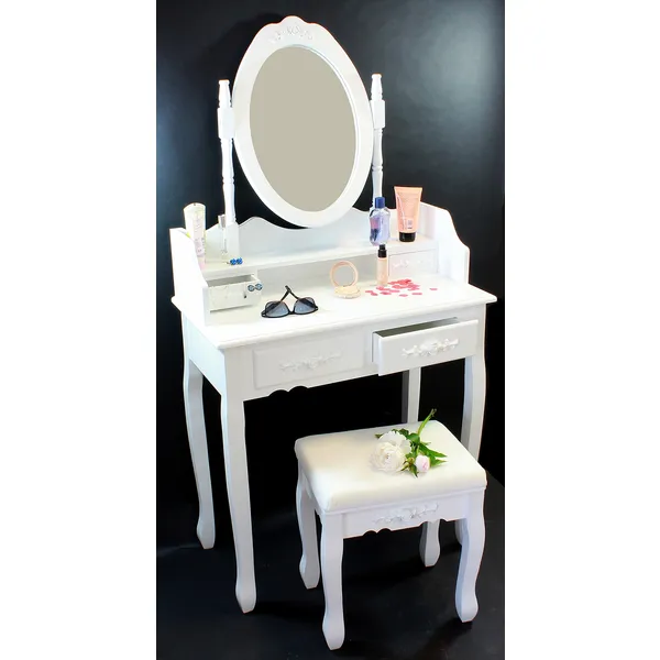Kozmetikai fésülködőasztal tükörrel és székkel, fehér