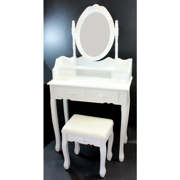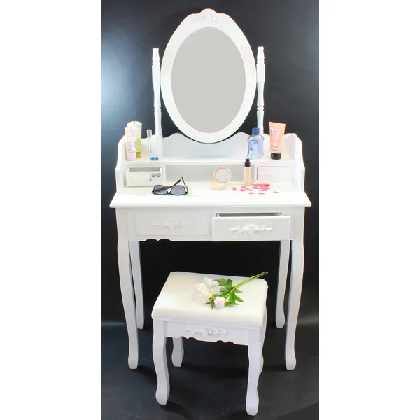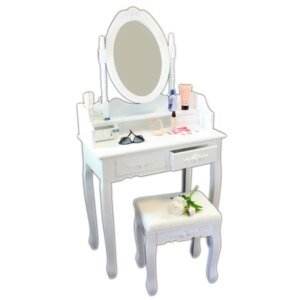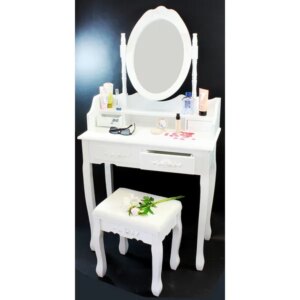 Teremts rendezett, kényelmes smink- és frizurakészítő sarkot ezzel a kozmetikai fésülködőasztallal. A nagy tükör segít a precíz sminkelésben és hajformázásban, a hozzá tartozó szék pedig stabil, kényelmes ülést biztosít a mindennapi rutin során.