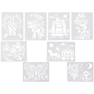 • 8 újrahasználható sablon – pillangó, kastélyok, sárkány, sellő, hintó, tündér és póni figurák.