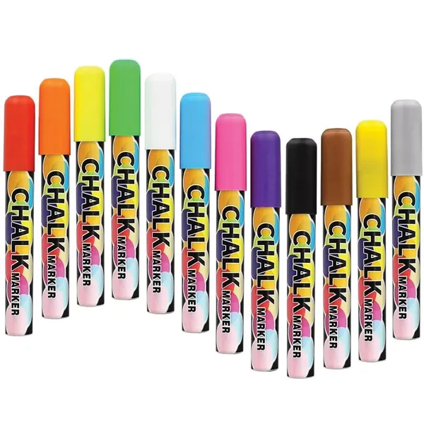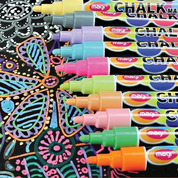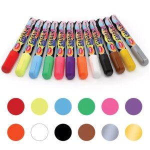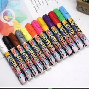 Pormentes, vízbázisú krétamarkerek élénk színekkel táblára, üvegre és más sima felületekre. Gyorsan száradnak, szagtalanok, és a felirat egy nedves kendővel könnyen letörölhető, így ideálisak prezentációkhoz, üzenőtáblához és kreatív dekorációhoz.