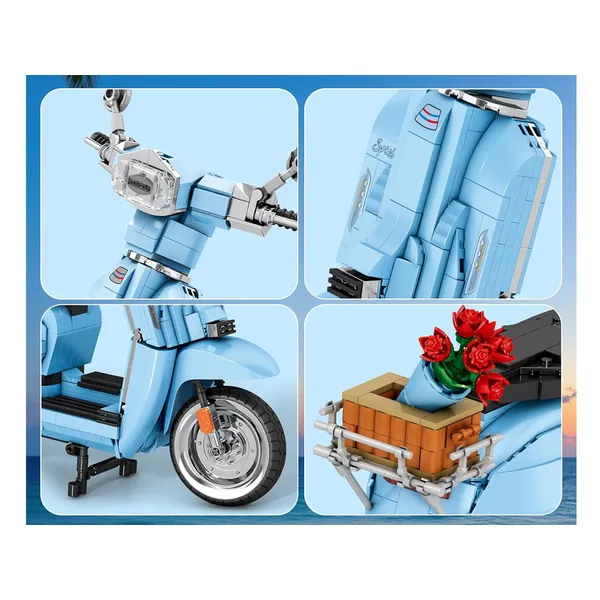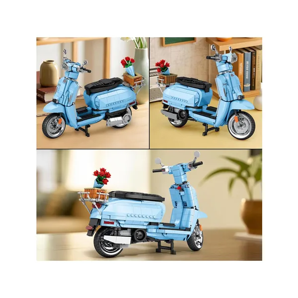 A licencelt készlettel 1169 elem illeszkedik precízen egymáshoz, hogy egy kék, klasszikus robogó élethű, részletgazdag mása szülessen saját kezeid alatt. Az építés fejleszti a kézügyességet és türelmet, a kész modell pedig stílusos dísz bármely polcon, akár otthon, akár modern irodában.