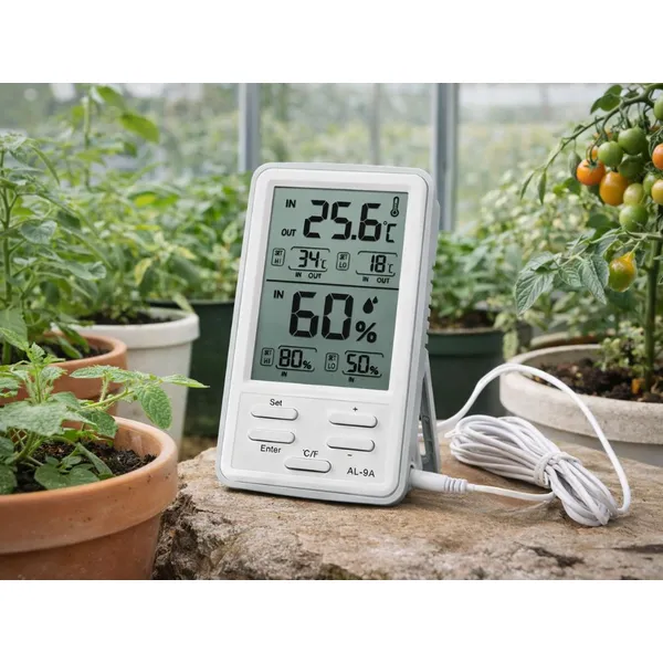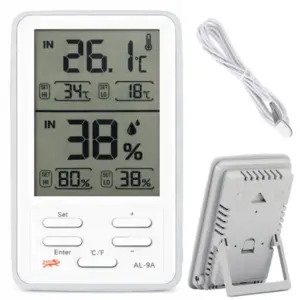 LCD időjárás-állomás, amely egyidejűleg segít nyomon követni a benti és kinti hőmérsékletet (kábelre szerelt külső szondával), valamint a belső páratartalmat a beépített higrométerrel. Ideális otthonba, üvegházba, terráriumba, kamrába vagy pincébe, ahol fontos a stabil klíma.