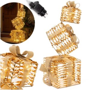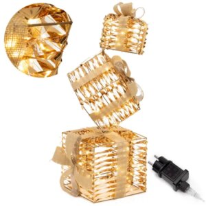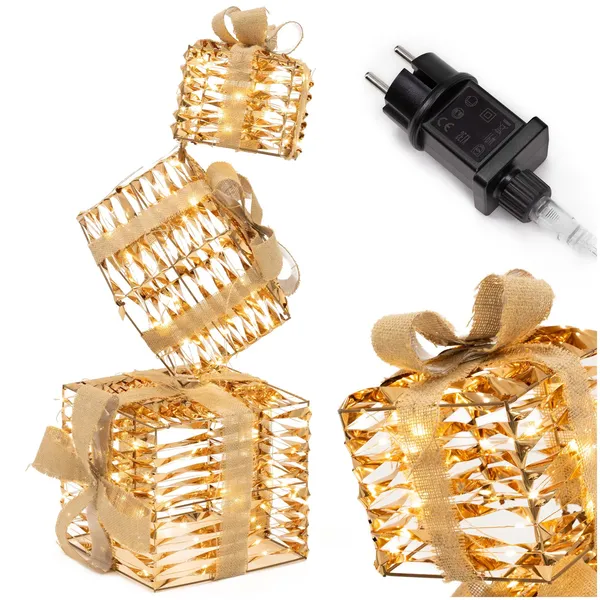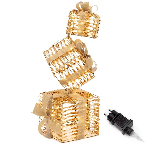A 3 részből álló, egymásra építhető „ajándéktorony” meleg fehér LED-fénnyel teszi látványossá a karácsonyi dekorációt a nappaliban, az előszobában vagy akár a teraszon. A fém vázra épített, fonott hatású borítás és a juta masni természetes, elegáns megjelenést ad.