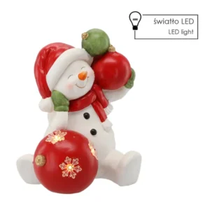 LED-es karácsonyi hóember figura gömbökkel, 26×24×32 cm, magnézia
