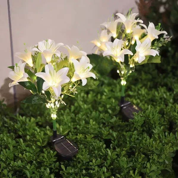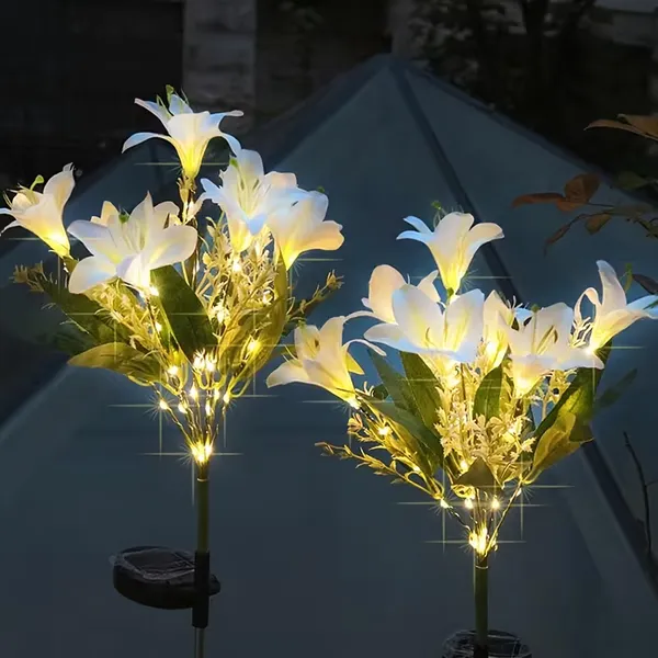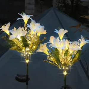 Leszúrható napelemes kerti LED lámpa liliom virág dísz – dekoratív, virág formájú kerti fény, amely napenergiával működik, így nem igényel hálózati áramot. Ideális kerti utak, virágágyások, teraszok vagy bejáratok hangulatos megvilágításához.