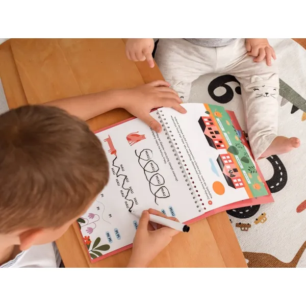 A letörölhető oldalakon a kicsik újra és újra gyakorolhatják az első betűk és szavak írását, miközben fejlődik finommotorikájuk és vizuális memóriájuk. A mellékelt szárazon törölhető filctollal bármikor javíthatnak, így a tanulás játék lesz.