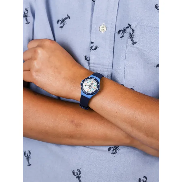 Masszív, könnyen leolvasható fiú gyermek karóra kék szíjjal, amely kényelmesen ül a csuklón egész nap. WR100 vízállóságának köszönhetően esőben és vizes játékoknál is bátran viselhető, így a mindennapi kalandokhoz is megbízható társ.