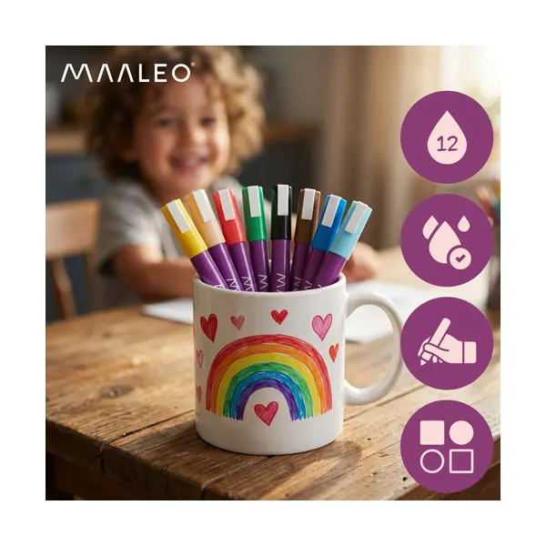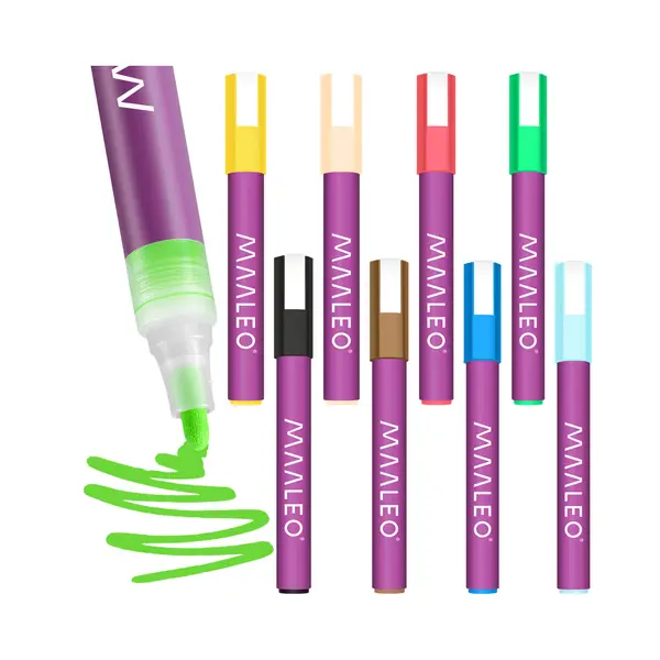 A Maaleo akril marker készlet valódi akrilfestékkel töltött filctollakat tartalmaz (nem vízbázisú tintát), így kifejezetten dekoráláshoz, festéshez és tartós minták készítéséhez ideális. Intenzív fedést ad, száradás után vízálló, és sokféle felületen használható – ecset és maszatolódás nélkül.