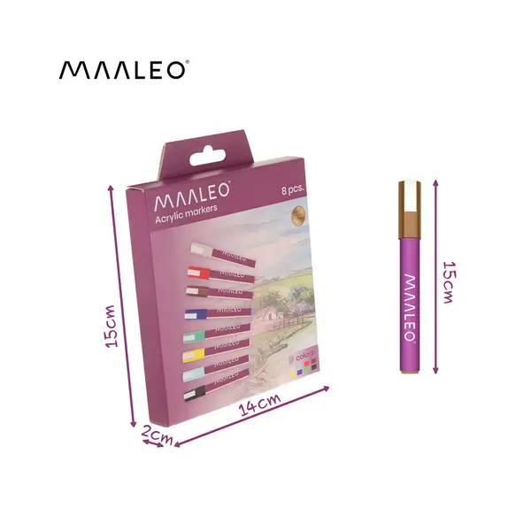 A csomag tartalma: 8 db Maaleo akril marker, 8 db színazonos kupak/dugó a kiszáradás ellen, valamint eredeti gyártói csomagolás és tárolódoboz. Tökéletes választás kőfestéshez, kreatív DIY projektekhez és tartós dekorációkhoz.