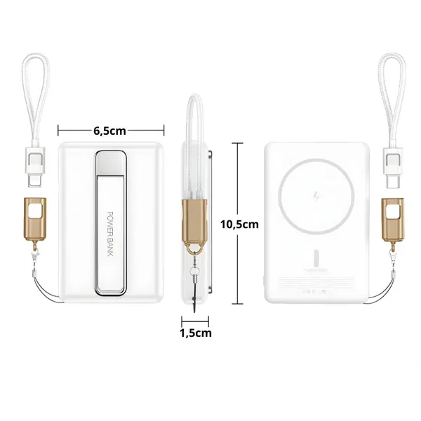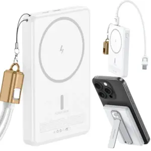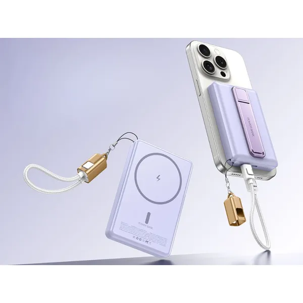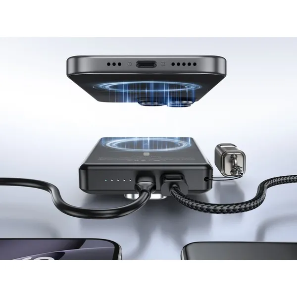 Kompakt, mágneses powerbank 5000 mAh kapacitással, amely kényelmes töltést biztosít vezeték nélkül és kábellel is. A beépített mágnes stabilan a telefon hátlapjához rögzíti, így töltés közben is komfortosan használhatod a készüléket.