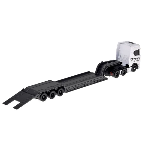 A fehér-szürke nyergesvontató levehető pótkocsija közel 25 cm-es teljes hosszt biztosít, így a mellékelt buldózer szállítása is valósághű. Kiállításra, diorámákhoz és kreatív munkagépes történetekhez egyaránt ideális.