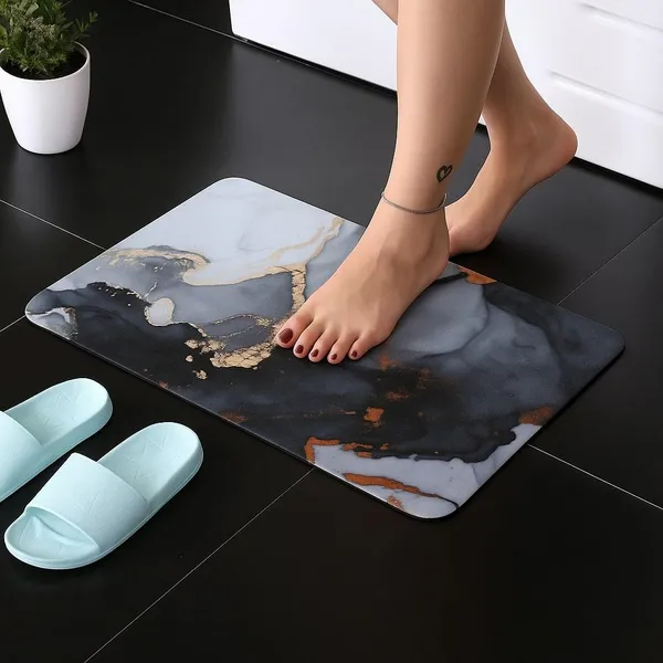 Hozd be a luxusmárvány eleganciáját a fürdőszobádba ezzel a 50×80 cm-es, arany részletekkel díszített szőnyeggel! A puha mikroszálas felület kényezteti a talpakat, míg a vastag szálak azonnal felszívják a vizet, hogy a padló száraz maradjon.