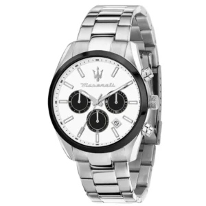 A Maserati Attrazione R8853151004 egy elegáns, modern férfi karóra, amely a sportos részleteket prémium megjelenéssel ötvözi. A fehér számlapon jól olvasható indexek, kronográf segédszámlapok és dátumkijelzés gondoskodnak a stílusról és a mindennapi praktikusságról.