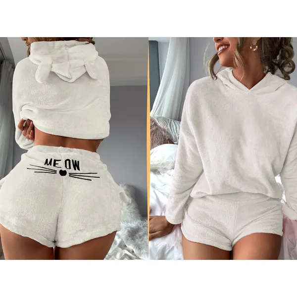 Meleg kapucnis női plüss pizsama szett, hosszú ujj és rövidnadrág, bézs L