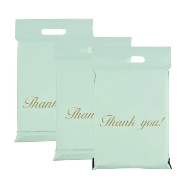 A 50 darabos, mentazöld futárfólia tasak készlet ideális webáruházaknak, akik sérülésmentesen és elegánsan szeretnék feladni közepes vagy nagy csomagjaikat. Az 500×600 mm-es, plusz 70 mm fogantyúval ellátott LDPE tasak „Thank You” felirata kedves gesztus a vásárlók felé.