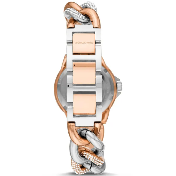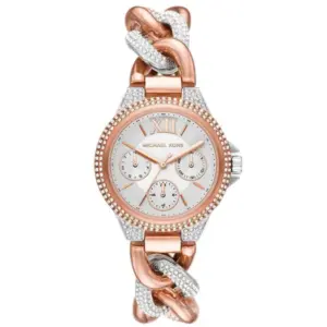 A Michael Kors Camille Mini MK6843 női karóra elegáns választás azoknak, akik a kifinomult, ékszerszerű kiegészítőket kedvelik. A rozsdamentes acél tok és szíj ezüst és rózsaarany színkombinációban készült, cirkónia díszítéssel, amely különösen nőies és látványos megjelenést ad az órának. Az ezüstszínű számlapot ásványi üveg védi, a pontos működésről pedig kvarc szerkezet gondoskodik.