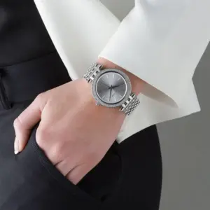 Elegáns, ezüstszínű női karóra cirkóniadíszítéssel, amely kifinomult megjelenést ad a hétköznapokon és alkalmakra is. A rozsdamentes acél kivitel, a pontos кварc szerkezet és az 5 ATM vízállóság egyszerre kínál stílust és praktikus használatot.