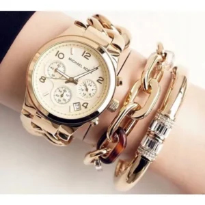 Egy igazi statement darab a csuklón: a Michael Kors MK3131 női karóra teljes egészében aranyszínű, fényes rozsdamentes acélból készült, így egyszerre elegáns és tartós. A 38 mm-es kerek tok alatt arany számlap rejtőzik arab számokkal és letisztult indexekkel, melyeket megbízható kvarc szerkezet mozgat pontosan.