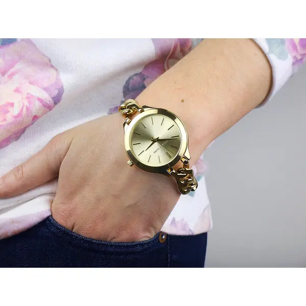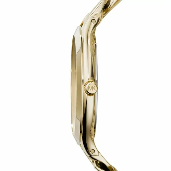 A Michael Kors MK3150 elegáns, arany színű női karóra rozsdamentes acél szíjjal. Az arab számok és indexek harmonikusan illeszkednek az arany számlaphoz és mutatókhoz, a pontos кварц (kvarc) szerkezet pedig megbízható időmérést biztosít a mindennapokban és alkalmakon is.