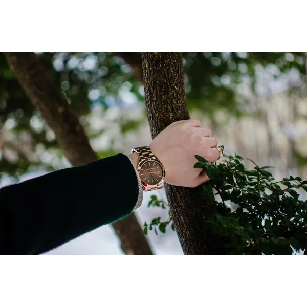 A rosegold színű tok és a hozzá illő nemesacél karkötő harmonikus összhatást teremtenek, míg a barna számlap különleges, meleg tónust ad az órának. A rendezett, egyszerű számlapkialakítás könnyed és elegáns megjelenést biztosít, ezért ez a modell hétköznapi és alkalmi öltözékhez is remekül illik.