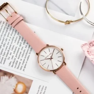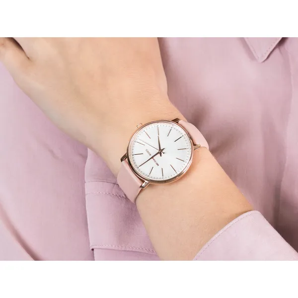 Elegáns, időtálló női karóra rozéarany színű acél tokkal és kényelmes, rózsaszín természetes bőrszíjjal. A pontos кварc szerkezet és a karcálló ásványi üveg gondtalan mindennapi viselést ad, a WR50 vízállóság pedig megvédi a kisebb fröccsenésektől.