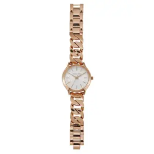 A Michael Kors Slim Runway női karóra elegáns, klasszikus választás a letisztult stílus kedvelőinek. A tok és a karkötő nemesacélból készült rózsaarany színben, amelyet ezüst színű számlap egészít ki, így az óra egyszerre nőies és időtálló megjelenésű. A pontos működésről elemes kvarc szerkezet gondoskodik.